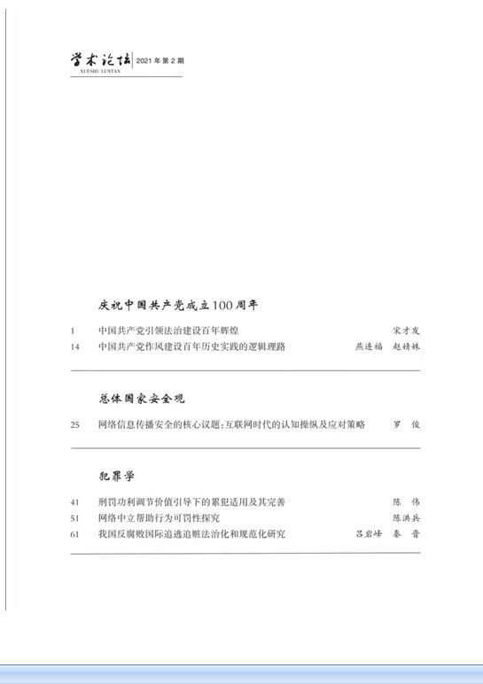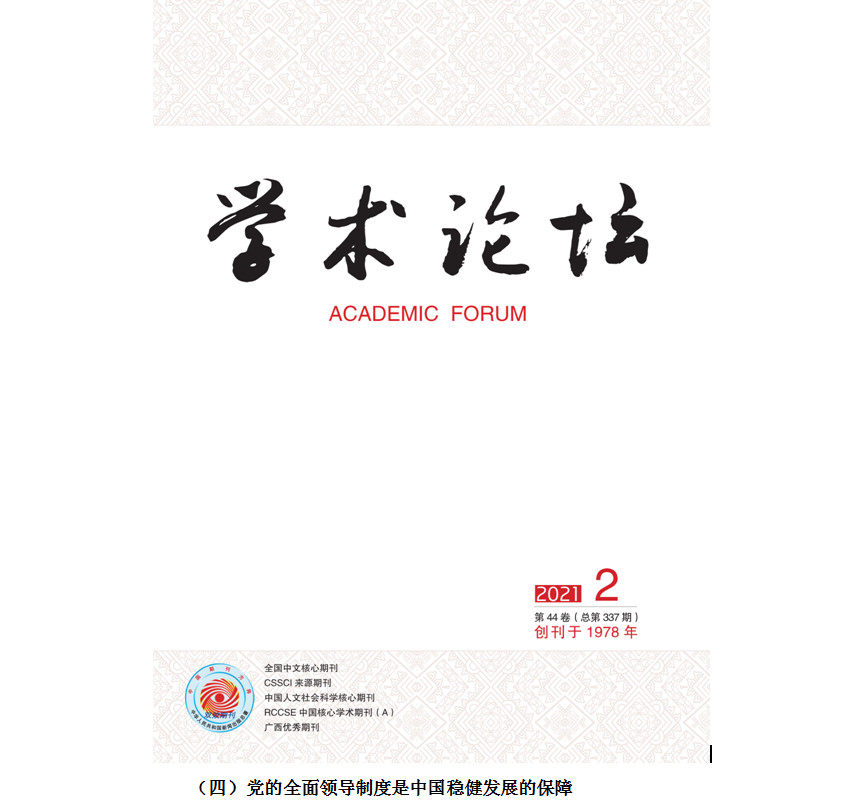北京8月10日电 完备的制度体系是中国稳健发展的定海神针,中国特色社会主义制度是克敌制胜的法宝, 社会主义基本经济制度是中国稳健发展的基础,社会主义政治制度是中国稳健发展的根本,党的全面领导制度是中国稳健发展的保障,构建更加成熟、定型的制度体系是执政党的历史使命。健全的法制体系是中国稳健发展的根本保障:制度之治是国家治理法治化的本质规定,宪法是国家治理法治化的根本大法,《民法典》是实现法治化的法律重器,党内法规是助推法治化的逻辑起点。有效的治理体系是中国稳健发展的关键举措:新型政党制度是有效治理体系的重要基石,完备法治体系是保障有效治理的内在依据,新型国际关系是实现有效治理的外在条件,严密监督体系是实现制度效力的根本保证。由广西社会科学院主管主办的全国中文核心期刊、CSSCI来源期刊、中国人文社会科学核心期刊、RCCSE中国核心学术期刊(A)、广西优秀期刊《学术论坛》杂志,2021年第2期开辟“庆祝中国共产党成立100周年”专栏,首篇发表宋才发教授《中国共产党引领法治建设百年辉煌》论文。