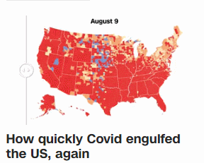 8月12日,美国有线电视新闻网(CNN)公布了六张图片,直观展现了从7月5日至8月9日一个多月时间里,代表疫情高危地区的红色如何再度覆盖全美的情况。这些触目惊心的图片,让人不禁想到在2020年11月13日,美国凯撒家庭基金会曾在官网上发布一张被红色覆盖的美国新冠肺炎疫情地图。这张疫情地图显示,当时除了远在太平洋的夏威夷州之外,全美49个州及首都华盛顿所在的哥伦比亚特区,全部沦为疫情严重地区。时隔9个月,噩梦在美国重演。