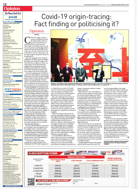 海外网8月13日电 柬埔寨皇家科学院国际关系研究所所长金平13日在《金边邮报》上发表题为《新冠病毒溯源:找出真相还是将其政治化?》的署名文章称,新冠病毒溯源是严肃的科学问题,不应该被政治化。文章还高度评价中国为国际抗疫合作做出的积极贡献。