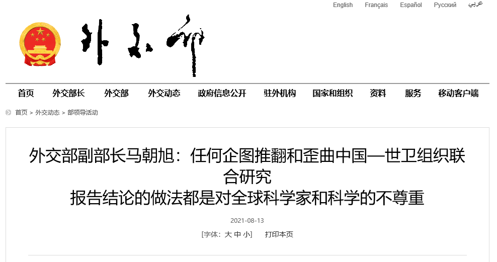 据外交部网站消息,2021年8月13日,外交部副部长马朝旭在新冠病毒溯源问题使节吹风会上表示,中国—世卫组织联合研究报告的形成,完全遵循世卫组织程序,采取了科学方法,已经被证明是一份有价值的、权威的、经得起科学检验、经得起历史检验的报告。这份报告已由世卫组织正式发布,理应成为全球溯源工作的基础和指南,任何企图推翻和歪曲联合研究报告结论的做法,都是政治操弄,也是对全球科学家和科学的不尊重。