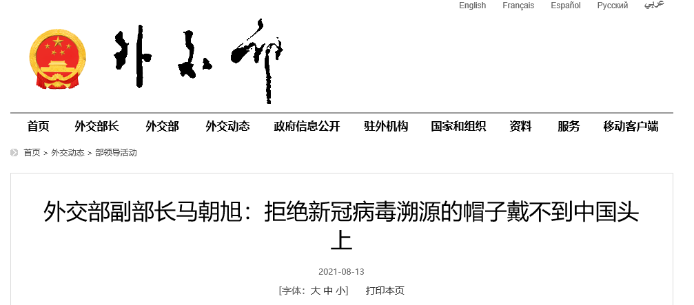 据外交部网站消息,2021年8月13日,外交部副部长马朝旭在新冠病毒溯源问题使节吹风会上表示,中方始终高度重视全球溯源工作,从疫情初期,中方就积极同世卫组织开展溯源合作,第一时间分享病毒基因序列,两次邀请世卫专家来华开展溯源研究。中方专家及时向世卫专家提交了中国方案,第一时间向世卫秘书处反馈了对其第二阶段工作计划的修改意见。中方正在积极落实联合研究报告建议,愿同各方分享中国溯源研究成果。中方反对的是政治溯源,反对的是违反世卫大会决议的溯源,反对的是抛弃第一阶段联合研究报告另起炉灶。美国等个别国家罔顾事实,指责中国拒绝溯源合作,这完全是颠倒黑白、混淆是非。拒绝溯源的帽子戴不到中国头上,戴到美国头上倒很合适。