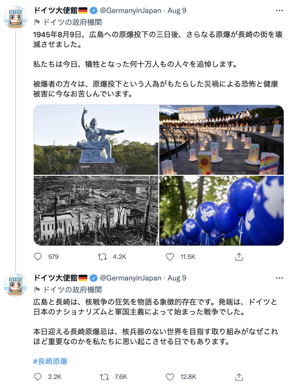 当地时间8月9日,德国驻日本大使馆在社交平台上发布推文,向万千原子弹受害者表示哀悼,同时呼吁人们勿忘历史,并提到“这一切的源头是德国和日本的民族主义和军国主义所引发的战争。”