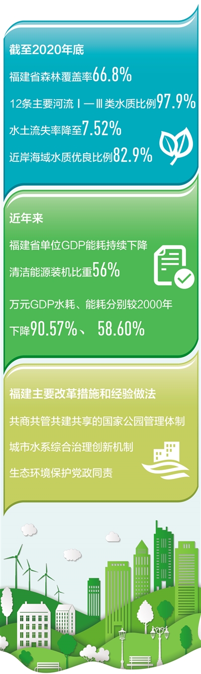 起步早、力度大、成效好、亮点多……7月召开的2021年生态文明贵阳国际论坛上,中国工程院发布评估报告,为福建生态省及生态文明试验区建设点赞。生态文明试验区建设5年来,福建稳步推进《国家生态文明试验区(福建)实施方案》部署的六大领域26项重点任务,按期取得38项重大改革成果,基本构建起产权清晰、多元参与、激励约束并重、系统完整的生态文明制度体系。