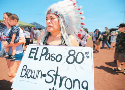 在美国得克萨斯州埃尔帕索市,印第安裔美国人普丽西拉·佩雷斯手举标语参加反种族主义集会。 新华社记者 王 迎摄