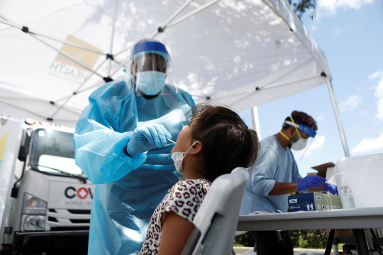 10岁的海莉·拉莫斯在美国佛罗里达州棕榈城的一个移动病毒检测点接受新冠病毒拭子检测。(图源:路透社)
