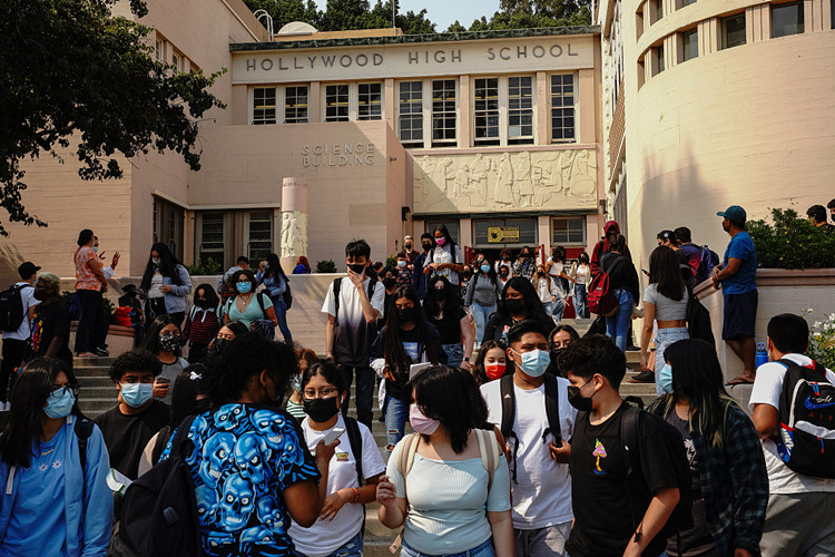 当地时间8月16日,美国加利福尼亚州洛杉矶的高中重新开学,学生回到校园。(图源:视觉中国)