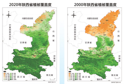 2020年与2000年陕西省植被覆盖度对比。陕西省气象局供图