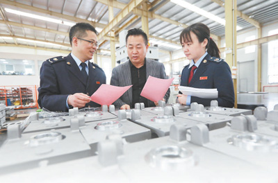 安徽省马鞍山市慈湖高新区税务局工作人员为企业职工介绍“放管服”改革政策。王文生摄