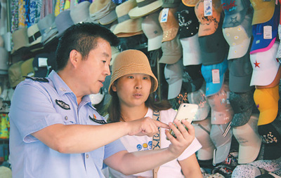曹金生(左)向群众询问走失人员情况。记者 原韬雄摄