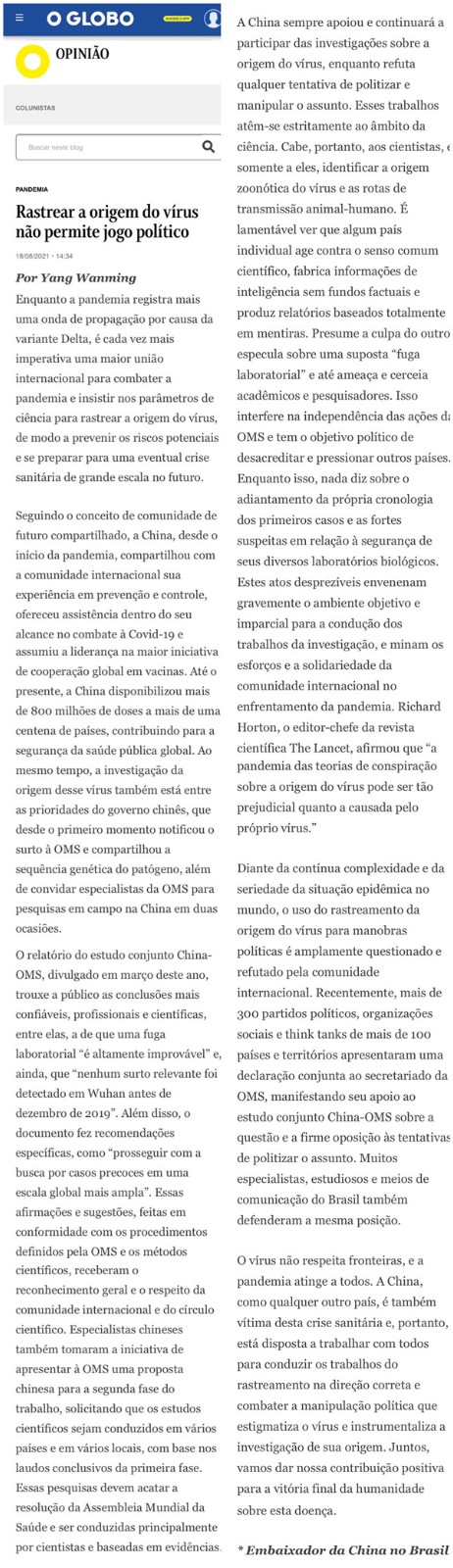 海外网8月19日电 据中国驻巴西大使馆网站消息,8月18日,杨万明大使在巴西主流大报《环球报》发表题为《新冠病毒溯源不容政治操弄》的署名文章。杨大使在文中指出,当前,德尔塔变异毒株正在全球加速蔓延,国际社会更加需要团结抗疫,秉持科学态度开展全球溯源合作。文章强调,中国始终支持并将继续参加科学溯源,但我们要坚决对政治溯源和政治操弄说不。少数国家违背科学常识,捏造没有真凭实据的情报信息,炮制完全基于谎言的报告,大搞针对别国的“有罪推定”,炒作所谓“实验室泄漏论”,甚至胁迫打压专家学者,干扰世卫组织独立履职,企图达到抹黑打压别国的政治目的。在全球疫情形势依旧复杂严峻的情况下,借溯源问题搞政治操弄的做法招致国际社会广泛质疑和普遍反对。中方愿同各方一道,坚持科学溯源的正确方向,坚决反对病毒污名化、溯源工具化的政治操弄,为人类最终战胜疫情作出积极贡献。