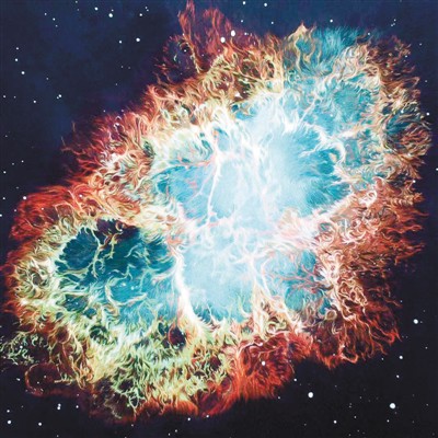 陈英华说,经过不断开拓,这一系列已有26幅作品,但这幅60cm×60cm的《蟹状星云》一直都是她最喜欢的。蟹状星云诞生于1054年发生的一次超新星爆发,我国宋代天文学家记录了这一天文现象,称其“芒角四出,色赤白”。这颗非常明亮的“客星”23天后消失。超新星的遗迹,就是蟹状星云。为了呈现逼真立体的效果,陈英华创新技法,尝试用不同方向的针法和粗细长短不一的丝线绣制。如为了表现蟹状星云缥缈的云雾感,最细的绣线是一根丝线的1/32,细如蛛丝。陈英华还为此独创了几款“星空针法”,表现出宇宙中亮光的星星点点以及喷发感。此外,她还结合穿珠的手法,将小珠子的立体感融合在画面中,使整个星空呈现出独特美感。
