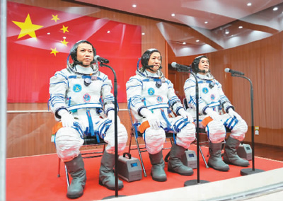 三位航天员不时与地面互动。