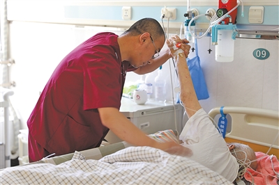 薛军平每天坚持给老陈做两小时的关节按摩,并鼓劲打气:“我护理过不少和您一样的患者,最后都康复了。您按医嘱做好药物治疗,我给您做好按摩康复,您一定可以恢复的!”