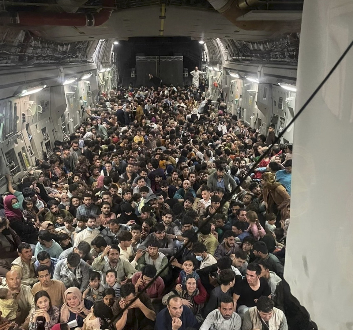 15日,一架美军运输机内,挤满撤离阿富汗的民众