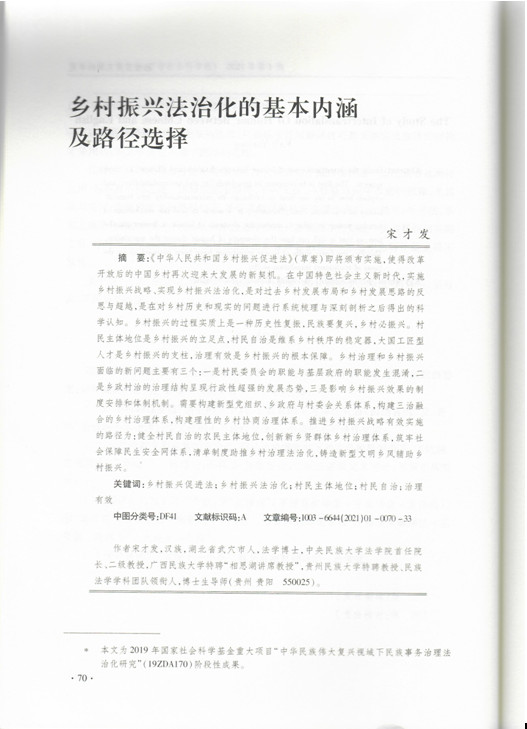 北京8月20日电 《乡村振兴促进法》的颁布实施,使得改革开放后的中国乡村再次迎来大发展的新契机。在中国特色社会主义新时代,实施乡村振兴战略、实现乡村振兴法治化,是对过去乡村发展布局和乡村发展思路的反思与超越,是在对乡村历史的和现实的问题进行系统梳理与深刻剖析之后得出的科学认知。乡村振兴的过程实质上是一种历史性复振,民族要复兴,乡村必振兴。村民主体地位是乡村振兴的立足点,村民自治是维系乡村秩序的稳定器,大国工匠型人才是乡村振兴的支柱,治理有效是乡村振兴的根本保障。乡村治理和乡村振兴面临的新问题主要有三个:一是村民委员会的职能与基层政府的职能发生混淆,二是乡政村治的治理结构呈现行政性超强的发展态势,三是影响乡村振兴效果的制度安排和体制机制。需要构建新型党组织、乡政府与村委会关系体系,构建三治融合的乡村治理体系,构建理性的乡村协商治理体系。推进乡村振兴战略有效实施的路径为:健全村民自治的农民主体地位,创新新乡贤群体乡村治理体系,筑牢社会保障民生安全网体系,清单制度助推乡村治理法治化,铸造新型文明乡风辅助乡村振兴。由贵州民族大学主管主办的“中国人文社会科学综合评价AMI”扩展期刊、全国高校优秀社科期刊、中国人文社会科学核心期刊、中国民族类核心期刊《贵州民族大学学报》(哲学社会科学版),2021年第1期发表宋才发教授《乡村振兴法治化的基本内涵及路径选择》论文。《贵州民族大学学报》主编王林、执行主编杨正万,副主编陈刚,本文由副主编陈刚任责任编辑。
