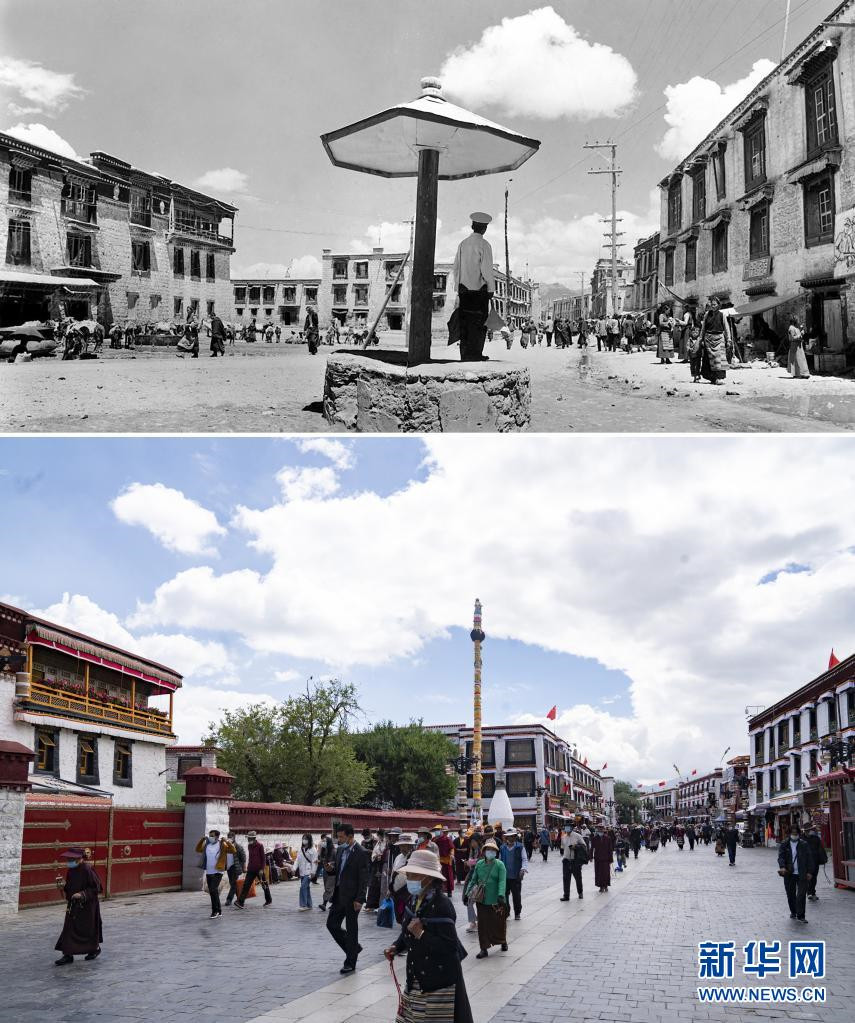 拼版照片:上图是20世纪50年代的拉萨市八廓街(新华社记者王纯德摄);下图是2021年8月13日拍摄的拉萨市八廓街(新华社记者觉果摄)。新华社发