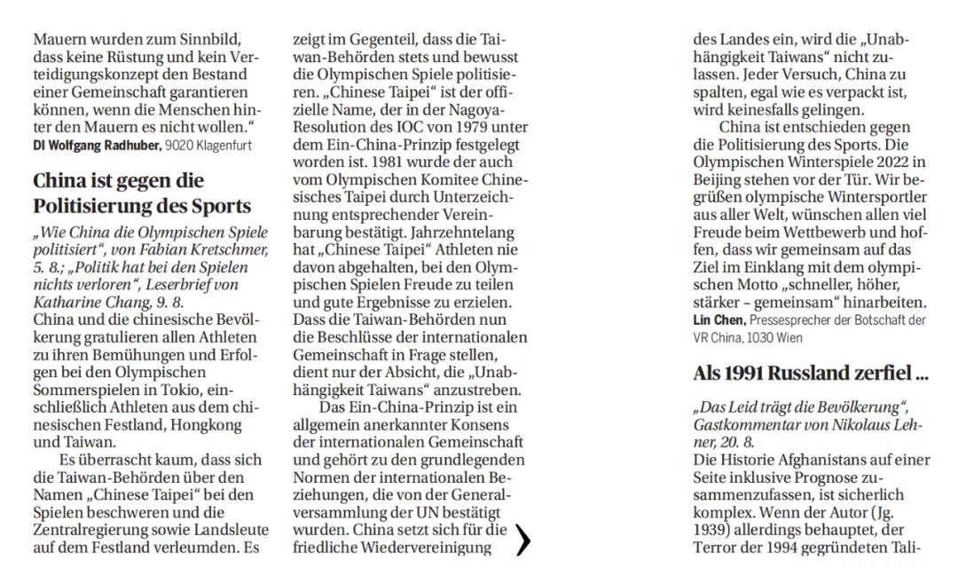 近日,台湾当局在奥地利所谓“代表”致信奥《新闻报》读者来信栏目,为台湾地区在东京奥运会上“中国台北”的名称鸣冤叫屈,污蔑攻击中央政府和大陆民众将奥运会“政治化”。8月21日,驻奥地利使馆发言人在《新闻报》读者来信栏目刊文《中国反对将体育运动政治化》,据理驳斥台当局有关不实谬论,揭批其“台独”实质,内容如下: