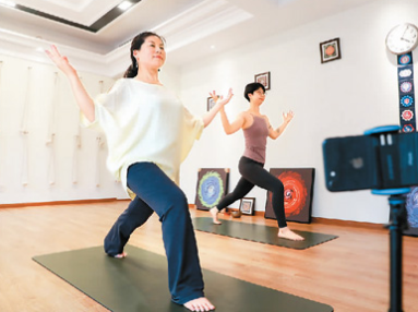浙江省湖州市德清县武康街道近日邀请瑜伽老师通过手机直播上课,让社区居民们可以在家运动,做到防疫健身两不误。赵宁 摄(人民图片)