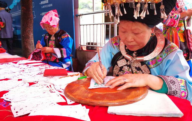 “凤凰艺术边边场”上苗族大妈展示传统剪纸艺术