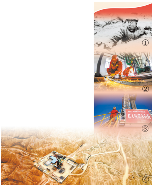 图片说明:图①:石油大会战中,王进喜忍着碱性泥浆带来的灼痛,用血肉之躯奋力搅拌泥浆。资料图片 图②:大庆油田工程建设公司员工在泵房内进行焊接和切割作业。资料图片 图③:大庆油田1205钻井队钻井工人在野外钻井平台作业。新华社记者 王松 摄 图④:8月3日,石油工人在位于新疆拜城县的塔里木油田克深10井区进行钻前施工。谭辉 摄(人民视觉)