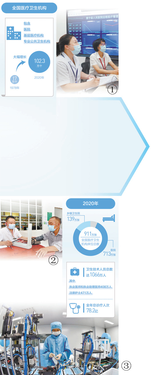 图①:浙江省丽水市景宁畲族自治县的医生在云诊室中心通过视频为郑坑乡郑坑村的患者诊疗。