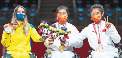 8月25日,轮椅击剑女子佩剑个人赛B级冠军谭淑梅(中)、亚军乌克兰队选手奥列娜·费多塔(左)、季军中国队选手肖蓉在颁奖仪式上。新华社记者 熊 琦摄