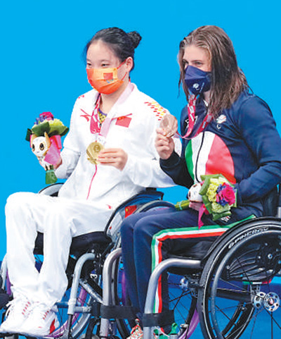 8月25日,游泳女子200米自由泳S5级冠军张丽(左)与意大利队选手在颁奖仪式上。影像中国