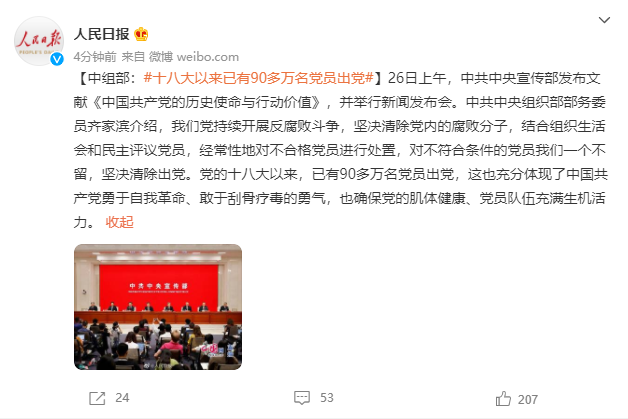 26日上午,中共中央宣传部发布文献《中国共产党的历史使命与行动价值》,并举行新闻发布会。中共中央组织部部务委员齐家滨介绍,我们党持续开展反腐败斗争,坚决清除党内的腐败分子,结合组织生活会和民主评议党员,经常性地对不合格党员进行处置,对不符合条件的党员我们一个不留,坚决清除出党。党的十八大以来,已有90多万名党员出党,这也充分体现了中国共产党勇于自我革命、敢于刮骨疗毒的勇气,也确保党的肌体健康、党员队伍充满生机活力。