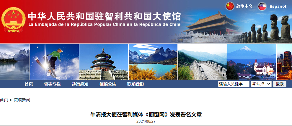 海外网8月27日电 据中国驻智利大使馆网站消息,8月24日,中国驻智利大使牛清报在智利第一大网媒《橱窗网》发表题为《中国在智投资互利共赢》的署名文章,对该网站16日发布的题为《智利:中国谋求嵌入拉美的平台》的评论文章中“中国投资威胁智利国家安全”的观点进行澄清和批驳。