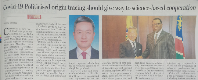 当地时间8月27日,中国驻纳米比亚大使张益明在当地主流媒体《太阳报》发表署名文章《坚持科学合作 反对政治溯源》。