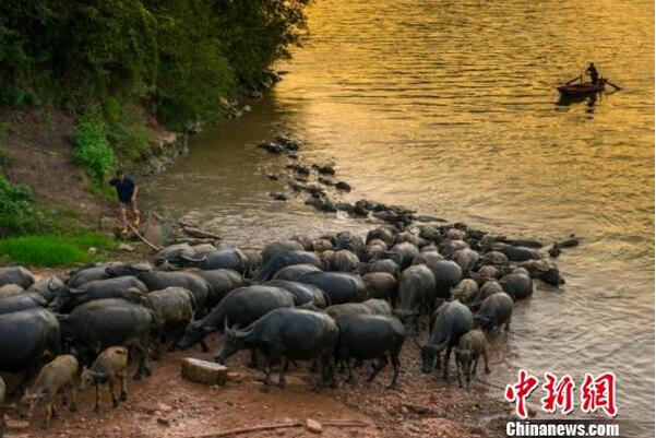 每天清晨,百余头大水牛横渡嘉陵江,上岛啃食青草,日暮则涉水归栏,颇为壮观。 刘永红 摄