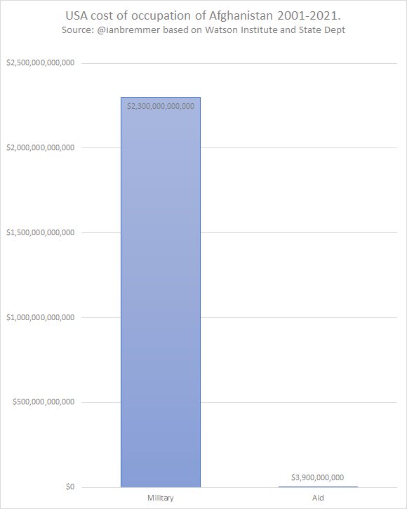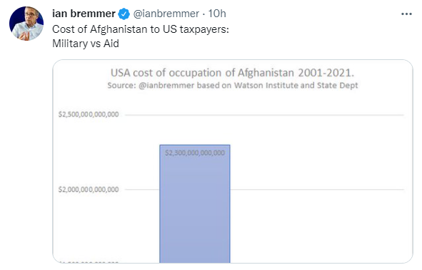 此外,美国政治风险咨询公司欧亚集团的执行总裁伊恩·布雷默1日发布了一张名为《2001年-2021年美国在阿富汗的开销》的图表。图表显示,20年来美国在阿富汗的军事开销高达2.3万亿美元,而用于援助的费用仅有39亿美元。(海外网 李芳)