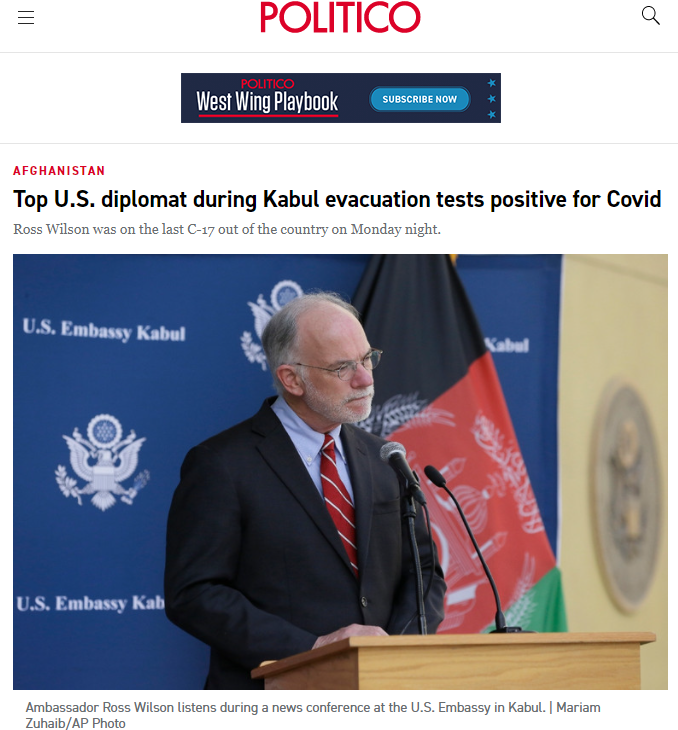 海外网9月2日电 美国“政治”网站1日报道称,三名知情人士透露,美国驻阿富汗大使馆代办罗斯·威尔逊新冠病毒检测呈阳性,目前有轻微的类似感冒的症状。他刚刚从喀布尔撤离。
