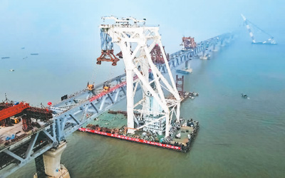 世界最深的桥梁钢管斜桩、首创钢管桩桩侧预压技术、世界桥梁建设史上首次大规模斜桩插打作业、创新3200吨钢梁整孔架设施工工艺……多项新技术新工艺将困难各个击破。