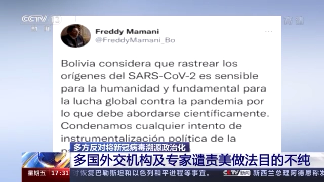 多国外交机构及专家近日批评美国将新冠病毒溯源政治化,指出相关工作属于科学范畴,应以科学方法推进。