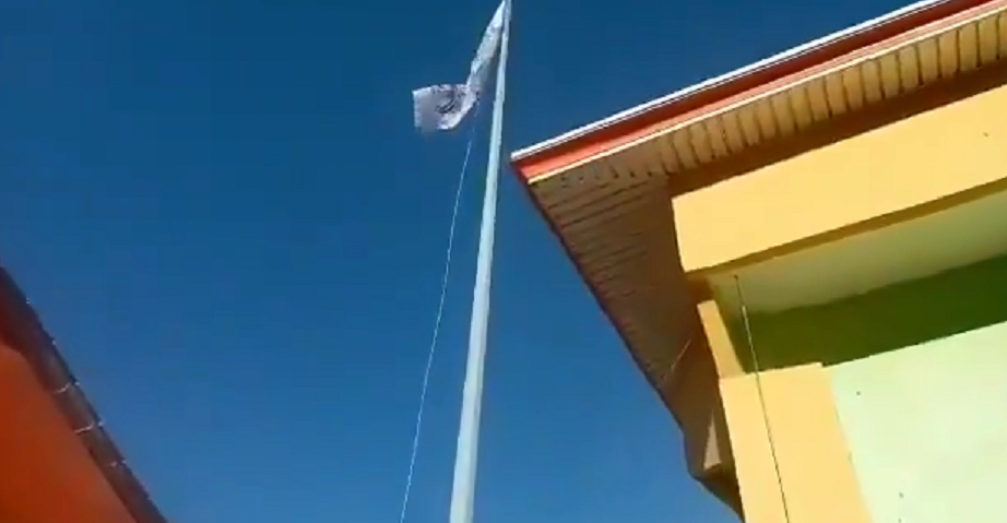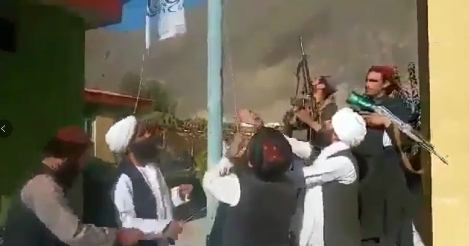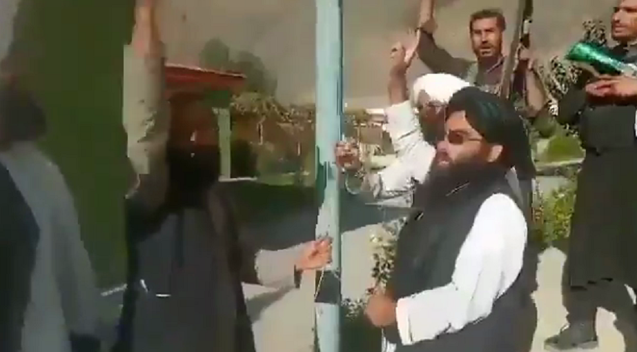 塔利班成员在潘杰希尔省省长办公室前升旗