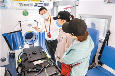 在健康卫生服务展馆外,一辆10多米的方舱卡车十分引人注目。这是北京市疾病预防控制中心展出的“移动P2+生物安全检测车”,它严格按照生物安全实验室标准建造,即停即检,可以第一时间对疫区内采集的人、动物、媒介生物等疑似样本进行分离、培养、检测作业,减少样品流转时间与待测人员流动,有利于缩小防控区域、提高检测效率,为疫情防控增添助力。