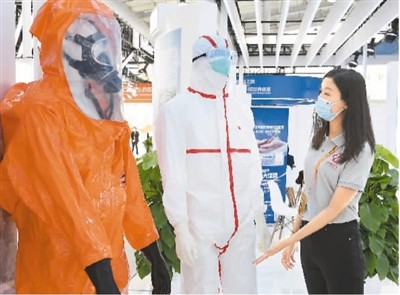 9月4日,在2021服贸会首钢园区健康卫生服务展馆,工作人员正在介绍防护服。新华社记者 任 超摄
