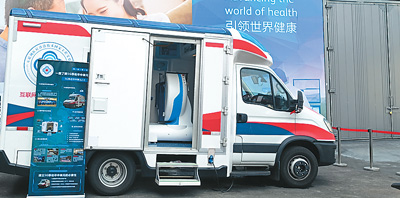 在健康卫生服务展馆南侧,一辆写有“5G移动卒中单元”的救护车很抢眼。蹬几级台阶走进车内,映入眼帘的是移动CT、检验设备、监测仪器等,可谓“麻雀虽小,五脏俱全”。首都医科大学宣武医院互联网医疗诊治技术国家工程实验室办公室主任尚国伟介绍,这是由宣武医院互联网医疗诊治技术国家工程实验室主导,联合中国联通、北创动力等公司共同开发的5G移动卒中单元,利用物联网、互联网、5G等创新技术,将卒中急救相关医务人员、信息、设备资源连接起来,形成患者“上车有专家、专家有工具、工具有平台、平台有信息、信息通患者”的救治整合模式,为患者抢占救治黄金时间,对于提升医疗机构对脑血管病为主的重大疾病的防控能力具有重要战略意义。