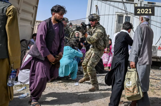 喀布尔机场,美士兵端起枪指向手无寸铁的阿富汗民众。图源:网络