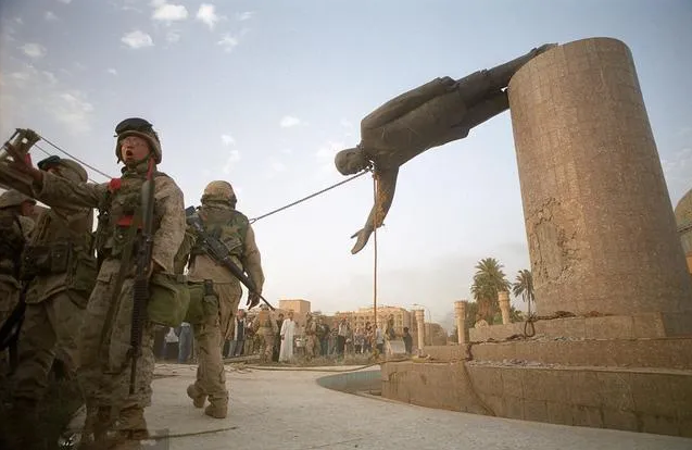 美军在伊拉克推倒萨达姆雕像。图源:美媒