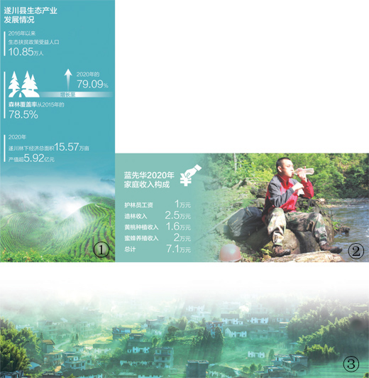 人不负青山,青山定不负人。担任生态护林员5年来,蓝先华管护的4300亩山林,从未发生过偷盗和破坏珍稀野生动植物案件。从护林到造林,蓝先华和10多个乡亲组建造林队,用绿色反哺大山,发展起生态产业,带动乡亲们脱了贫、致了富,蹚出一条“林农增收、青山增绿、乡村增彩”的小康路。