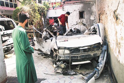 图为9月2日,阿富汗喀布尔一处被美军空袭过的居民区的居民站在汽车残骸旁。塞夫拉赫曼·萨菲摄(新华社发)