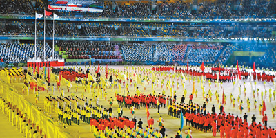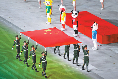 20时,仪仗队员护拥五星红旗健步走入体育场。会旗方阵过后,各代表团依次入场,此起彼伏的欢呼、自信阳光的笑容,在体育场中飞扬。