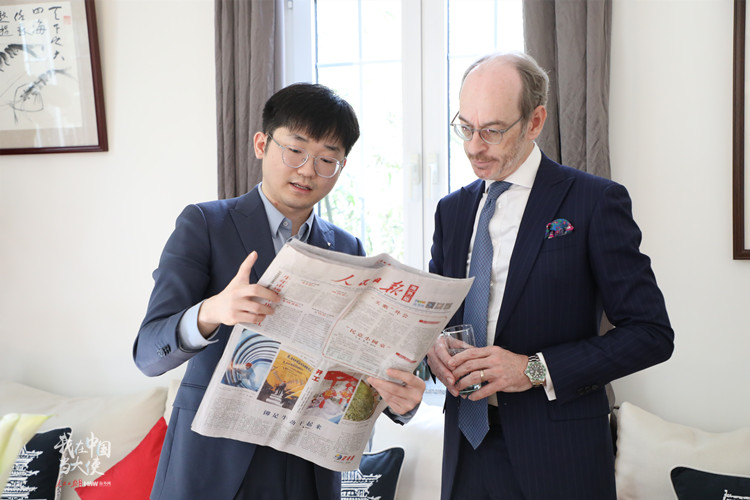 卢森堡驻华大使俞博生(右)接受人民日报海外网采访。(付勇超摄)