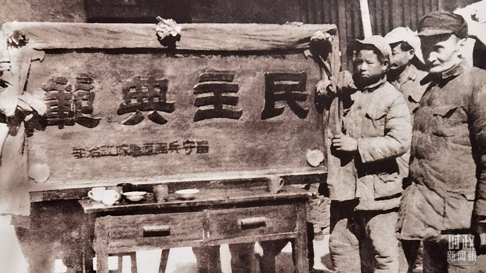 △陕甘宁边区政府接受八路军留守兵团赠送的“民主典范”牌匾。(总台央视记者马立飞提供)