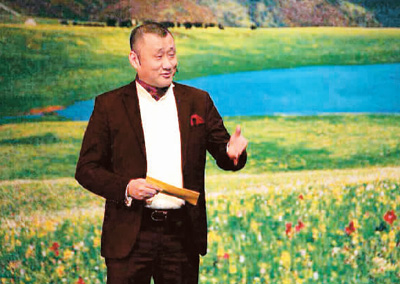 范轩在法兰克福藏历新年晚会上与德国观众分享藏区见闻。
