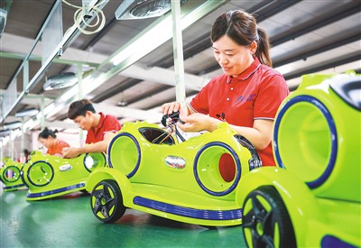 图为9月15日,河北省邢台市平乡县河古庙镇一家童车企业员工在加紧赶制一批出口订单。柴更利摄(人民视觉)