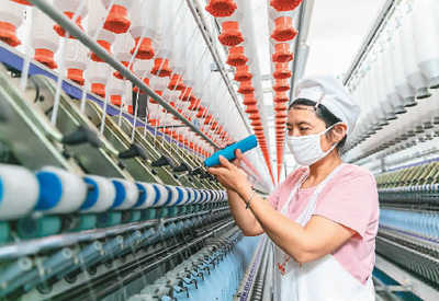 图为9月15日,江苏省海安市一纺织公司车间内,工人在生产线上忙碌。翟慧勇摄(人民视觉)
