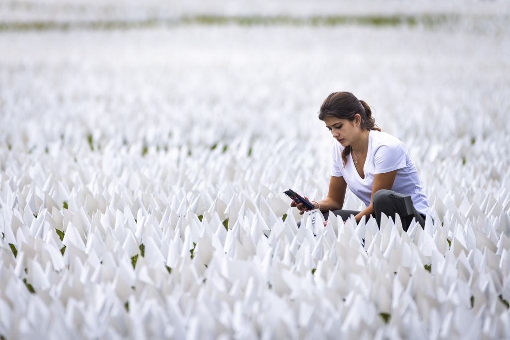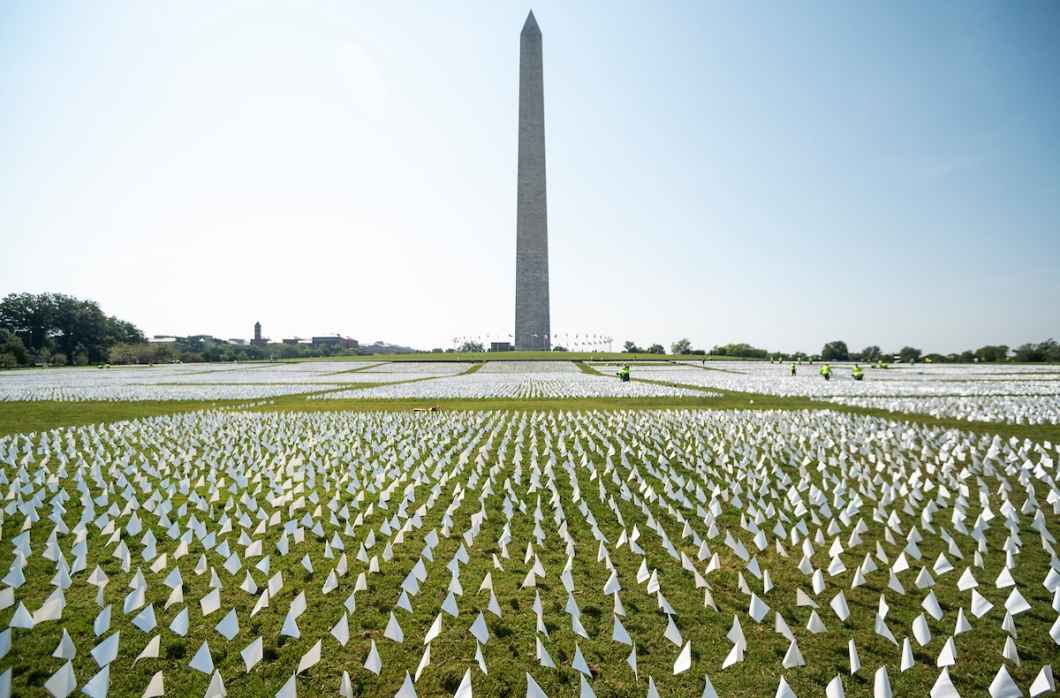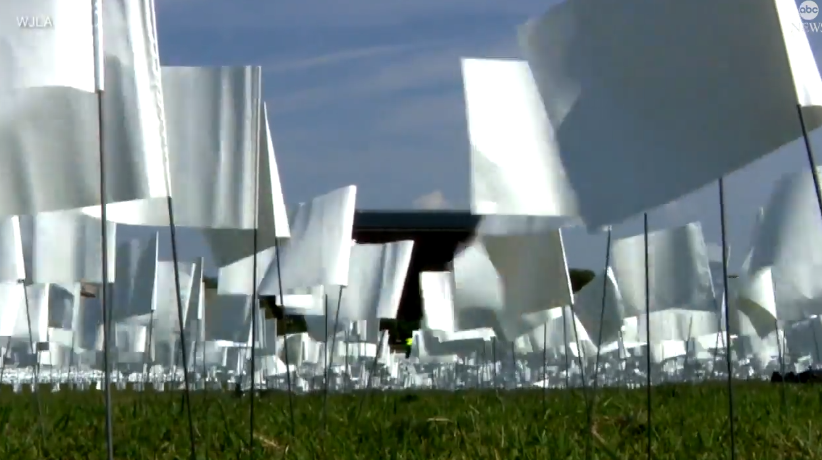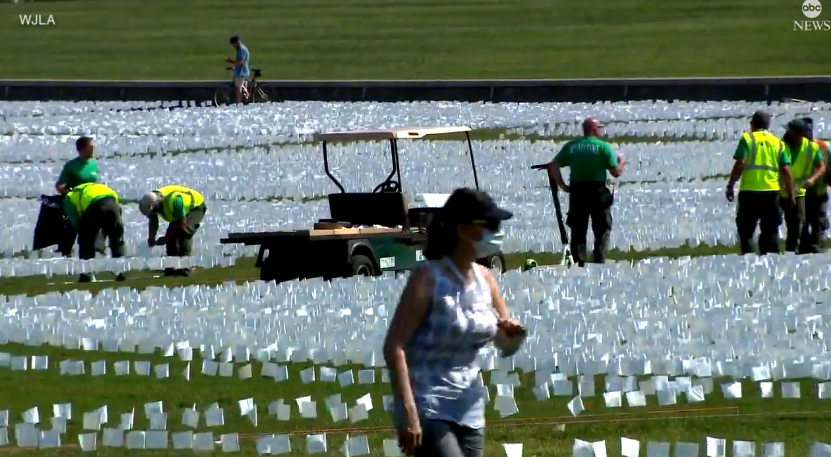 现场!华盛顿竖66万面白旗纪念新冠死者 阳光下